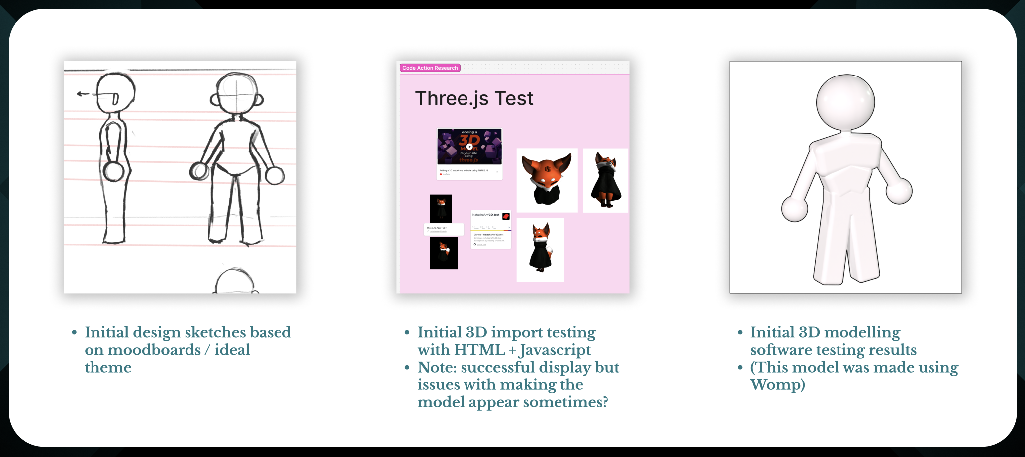 Our first steps of action research come from researching how to import 3D models into code / testing if we can execute this (Natasha) and researching what software would be most compatible and useful to learn in order to creat our 3D models (Lucy). Altogether we also researched existing Character Creator websites (as well as trend research for our initial 3 ideas) in order to test their UI and theming.